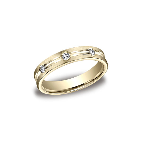 This beautiful 4mm comfort-fit bezel set diamond eternity band features a satin-finished and high polished center trim between 8 round ideal-cut diamonds. Total diamond carat weight is approximately .32ct.