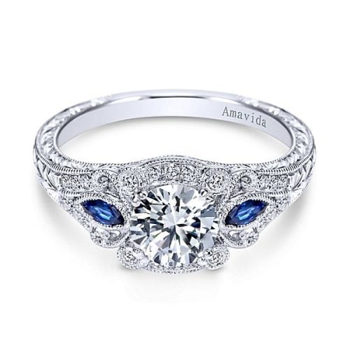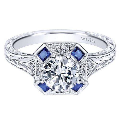 Vintage Platinum Amavida Round 3 Stones Halo Diamond A Quality Sapphire Engagement Ring