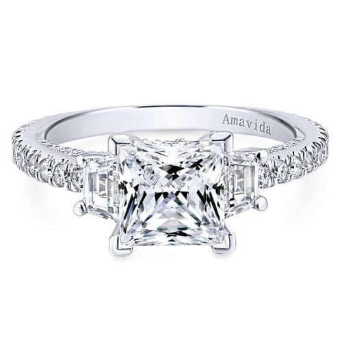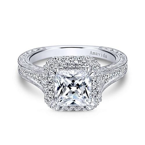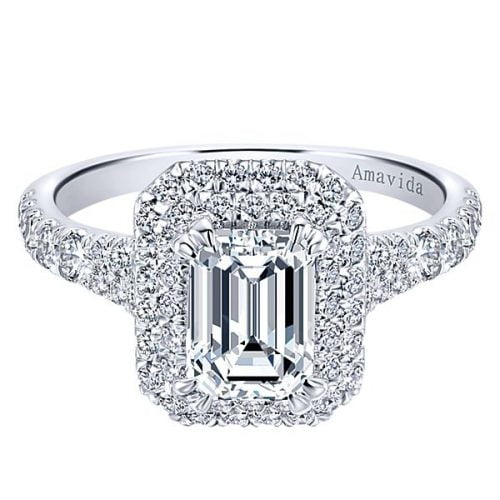 18k White Gold Amavida Emerald Cut Double Halo Diamond Engagement Ring