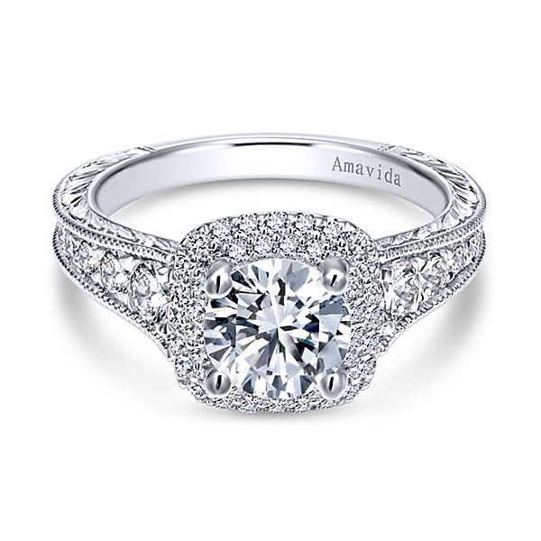 This double halo engagement ring would not be complete without the reverse tapered band featuring a strand of graduated round diamonds.